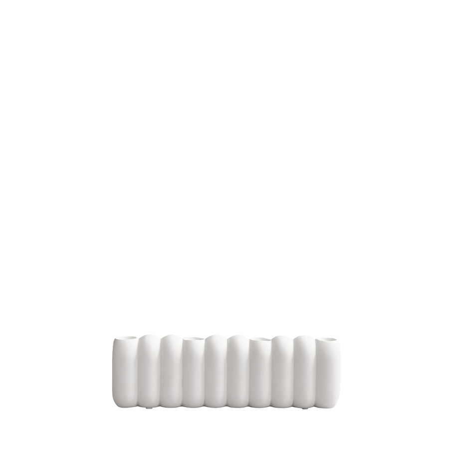 This long, solid candle holder features a unique ripped stacked design in a matte white finish, creating an intriguing, sculptural presence. Its minimalist yet dynamic form makes it an excellent choice for modern interiors. Style it with tapered candles in soft neutral tones for an elegant, understated look, or contrast it with darker accents for added depth.
