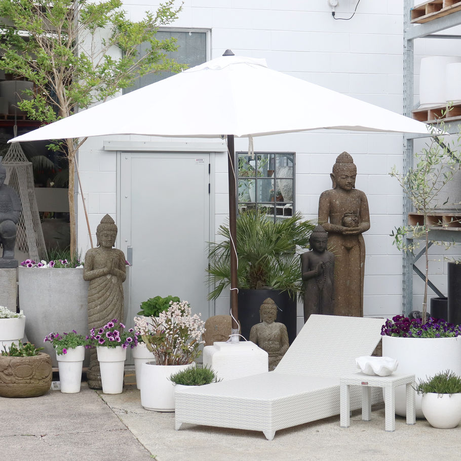 The crisp white tone of this umbrella contrasts beautifully with outdoor greenery, adding a relaxed, resort-like feel. Its large canopy provides ample shade, while the tall height allows easy movement beneath. The adjustable strung design offers flexibility, and when paired with tall pots, it enhances the style and comfort of any space.